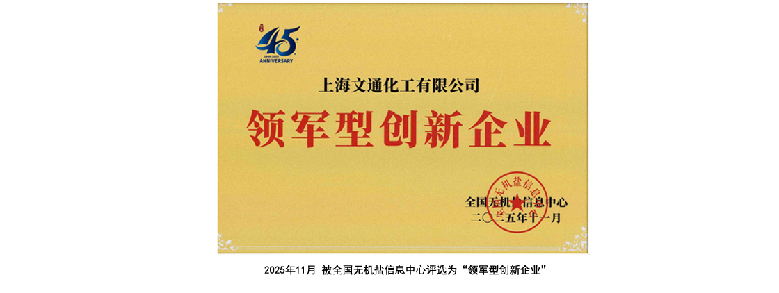 2025年11月 上海文通化工有限公司被全國(guó)無(wú)機(jī)鹽信息中心評(píng)選為“領(lǐng)軍型創(chuàng)新企業(yè)”